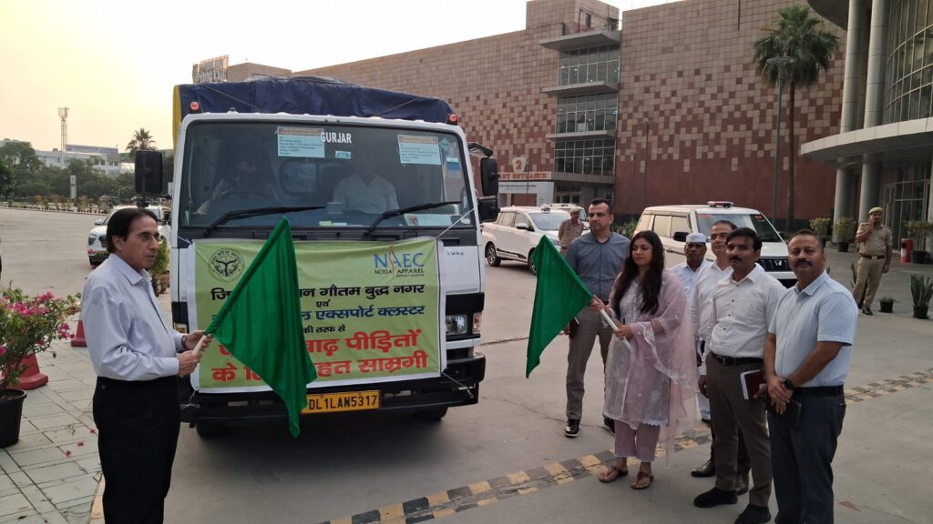 यह राहत सामग्री जिला प्रशासन एवं नोएडा अपैरल एक्सपोर्ट क्लस्टर (NAEC) के संयुक्त प्रयास से भेजी गई है। सामग्री में 13500 Apparel’s, 1500 मेडिकल किट, 500 दूध बॉक्स एवं अन्य राहत सामग्रियाँ सम्मिलित हैं।
